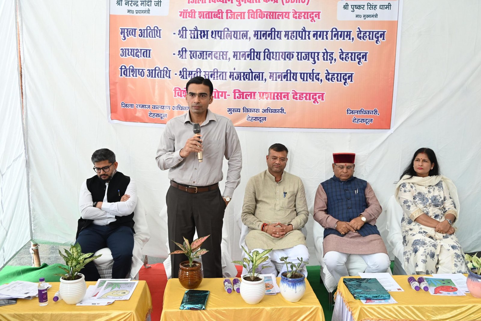 गांधी शताब्दी जिला चिकित्सालय में बुधवार को रायपुर विधायक खजानदास की अध्यक्षता में आयोजित कार्यक्रम में मुख्य अतिथि महापौर सौरभ थपलियाल, विशिष्ट अतिथि देहरादून पार्षद सुनीता मंजखोला, जिलाधिकारी सविन बंसल और मुख्य विकास अधिकारी अभिनव शाह ने जिला दिव्यांगजन पुनर्वास केंद्र का विधिवत उद्घाटन किया।